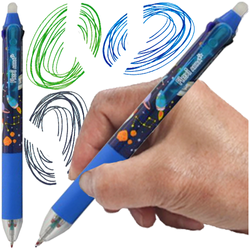 - Trzykolorowy długopis ścieralny z gumowym, antypoślizgowym uchwytem zwiększającym komfort pisania.